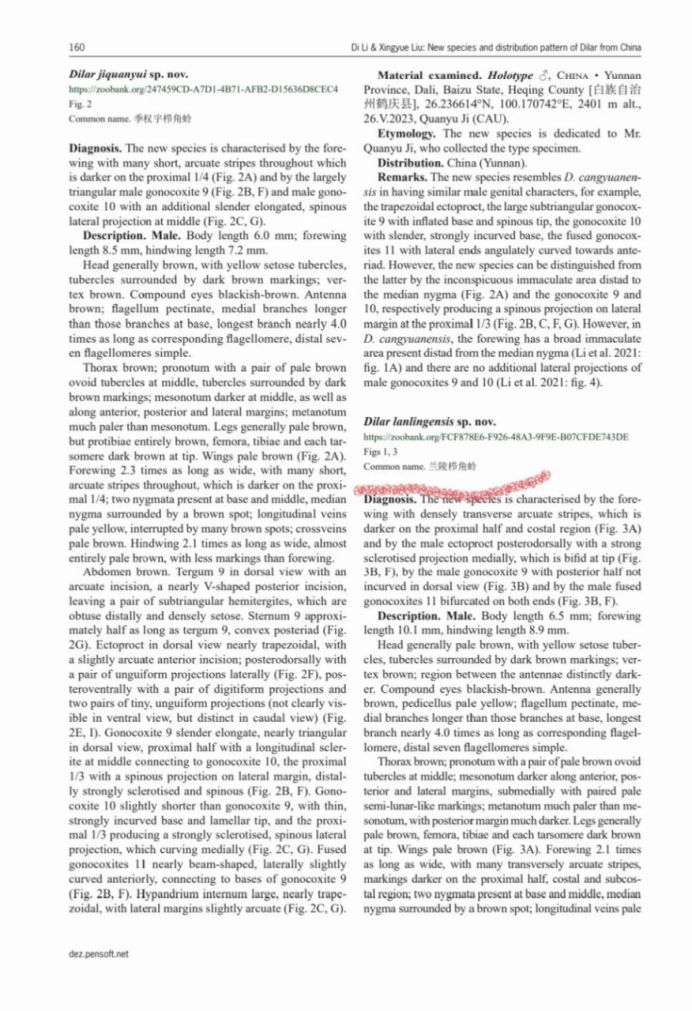 几天后,王天骄将标本寄给了中国农业大学研究脉翅目的昆虫学专家。“经过解剖和初步鉴定,专家确认这是一个未被描述过的新物种。经过一段时间的等待,今年10月,相关论文正式发表,新物种得以确认。”王天骄说。