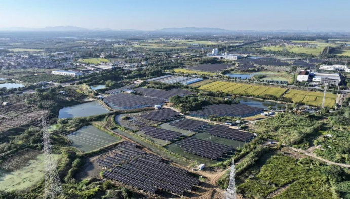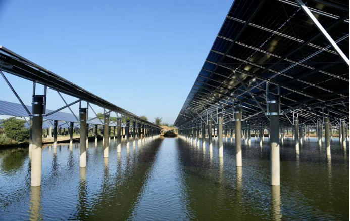 如果说“茶光互补”是向空间要效益,那么“渔光互补”则是向水面要潜力。在司徒镇丁庄村,760亩的鱼塘水面被划分成多个区域,一片片蔚蓝色“光电海洋”随波光跃动,将水面变成收集阳光、输送电力的“能量方阵”。