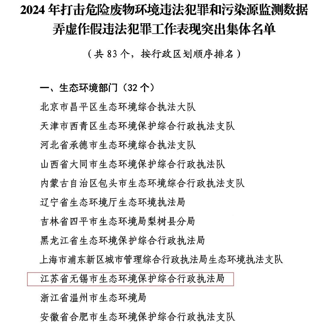 近日,生态环境部、最高人民检察院、公安部联合对在2024年打击危险废物环境违法犯罪和污染源监测数据弄虚作假违法犯罪(以下简称“两打”)工作中表现突出的83个集体和169名个人予以通报表扬,无锡市生态环境综合行政执法局光荣上榜,成为江苏省生态环境系统唯一获此殊荣的集体单位。