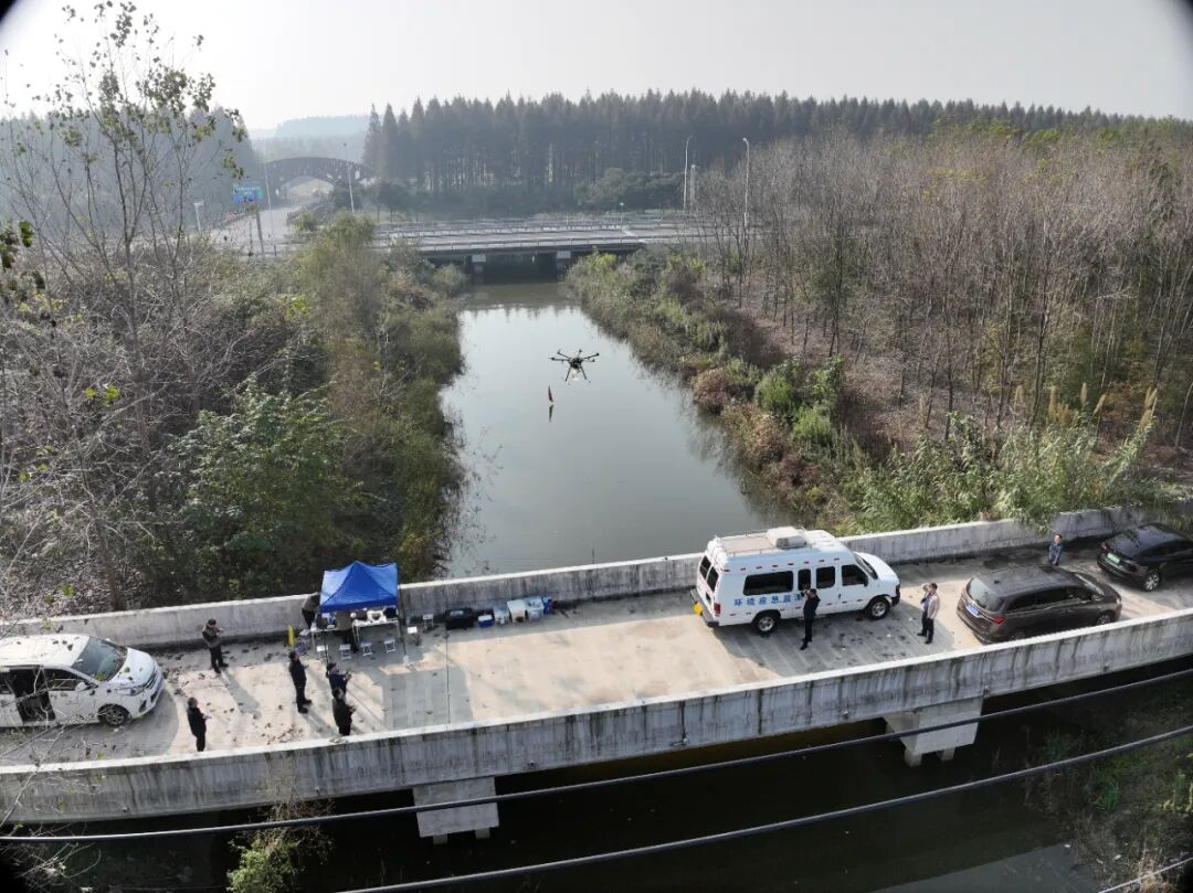 应急监测人员利用无人机快速采集水样