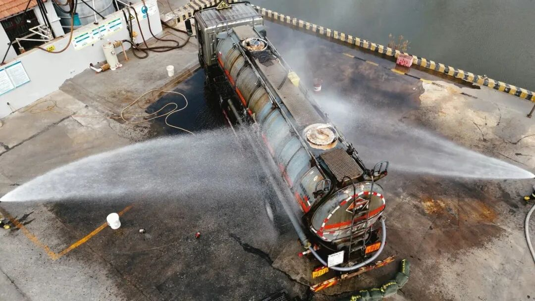 现场立即形成了“两线作战”的态势:一方面,消防队员身着重型防化服,在雾状水幕的掩护下对槽罐车展开救援;另一方面,企业技术人员紧急关闭相关阀门,消防人员在泄漏点周边构建隔离水幕,严防酸雾扩散。