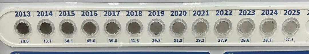 1月19日,在南京市生态环境指挥调度中心看到了13个刚刚“上新”的滤膜,这些用于监测PM2.5浓度的滤膜,如同“年轮”一般直观展现了南京13年来的空气变化——从2013年的每立方米78微克到2025年的每立方米27.1微克,降幅达65.3%,滤膜从黑到灰到灰白到泛白,无声地诉说着一微克一微克“抠”出来的治气成效,这在全省是首次公开展示。
