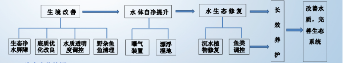 通过种植多种沉水植物29070m2、挺水植物370m2,投放底栖动物1500kg,设置漂浮湿地180m2、曝气装置10套,并开展全域水域清杂、底质改良和水质调节等措施,进一步构建完善生态系自净系统,恢复水生动植物种类12—16种(含观赏性植物3—5种,濒危保护动植物2—3种),生物多样性显著提高。