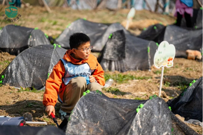 情景剧结束后,孩子们迫不及待地去菌园,查看去年十一月亲手种下的蘑菇。经过一个冬天的等待,大球盖菇的菌丝在土壤里留下了显眼的痕迹。