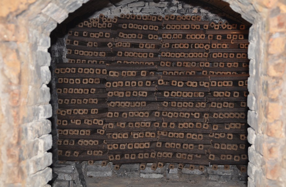 定型的秸秆制品整齐地堆放在炉中正在等待高温炭化