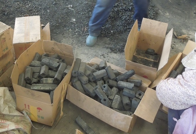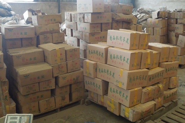 工人们正将制成的机制炭装箱