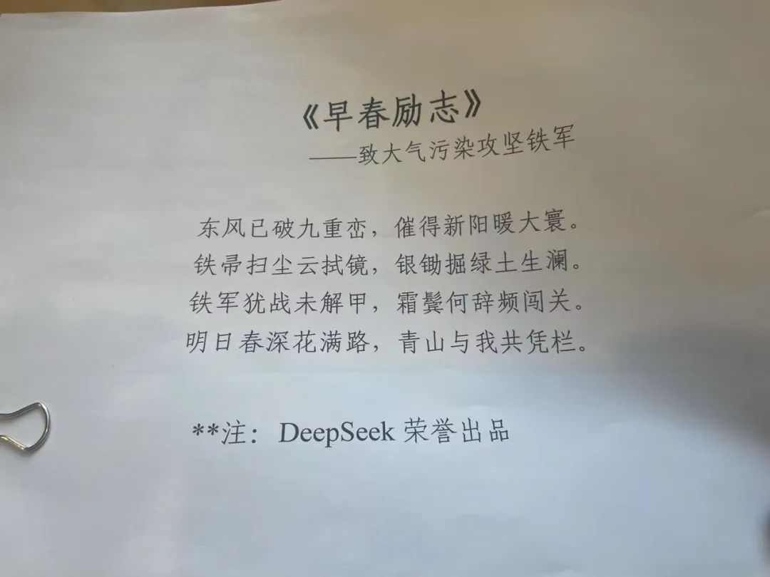 2月24日,生态环境部举行例行新闻发布会。在发布会上,生态环境部大气环境司司长李天威念了一首用DeepSeek为“大气污染攻坚铁军”作的诗,与大气污染防治攻坚的战友们共勉。