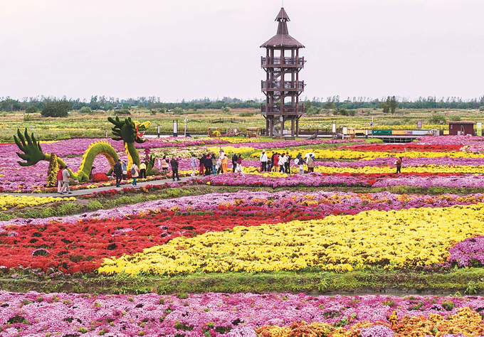 金秋十月,兴化市千垛景区的菊花进入盛花期,垛上五彩斑斓,犹如画卷,吸引众多游客前来赏菊游玩。周社根 摄 (视觉江苏网供图)