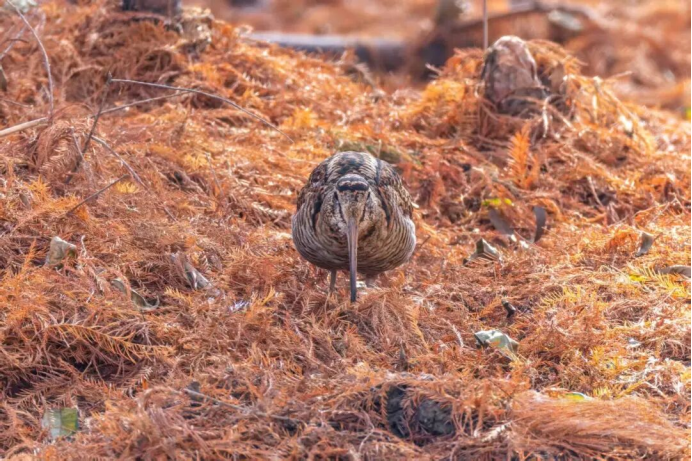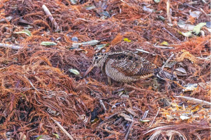 “本应在夜晚活动的丘鹬,竟然在白天现身了!”近日,鸟类观察员徐斌在白塘公园荷花池边一个铺满落叶与枯草的小岛上,敏锐捕捉到一抹几乎与环境融为一体的棕褐色精灵。那是一只丘鹬,正用标志性长喙,悠闲地在松软的泥土中翻找食物。“它的伪装太好了,要不是偶尔动一下,眼神差一点根本发现不了。”徐斌说。