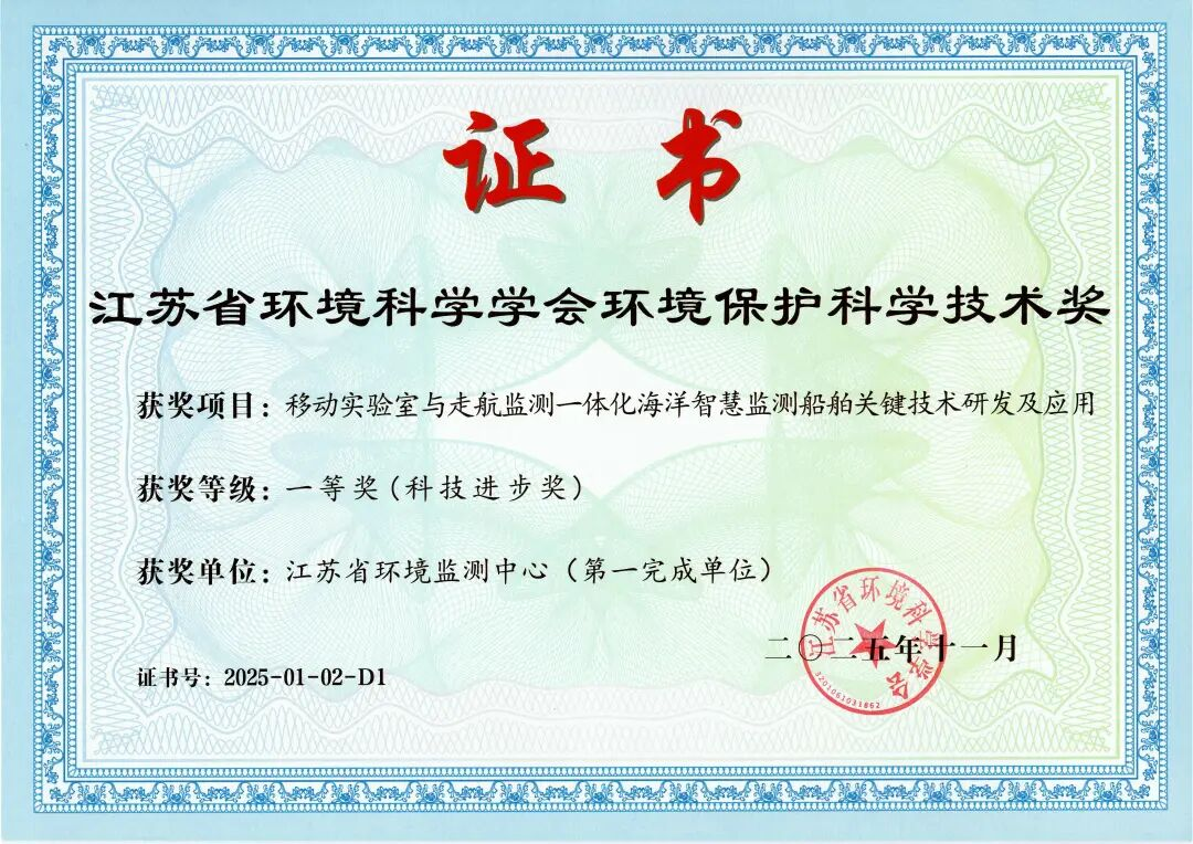因其显著的创新性与应用价值,该成果荣获2025年度江苏省环境科学学会环境保护科学技术奖一等奖(科技进步奖)。基于该成果打造的江苏首艘海洋生态环境监测执法船——“中国环监苏001”自2022年四季度投运以来,累计航行超19000海里,成功执行31项重大专项监测及突发环境应急任务,已成为我省履行海洋及沿江生态环境监测、应急响应和监督执法职责不可或缺的核心利器,实战效能得到充分验证。
